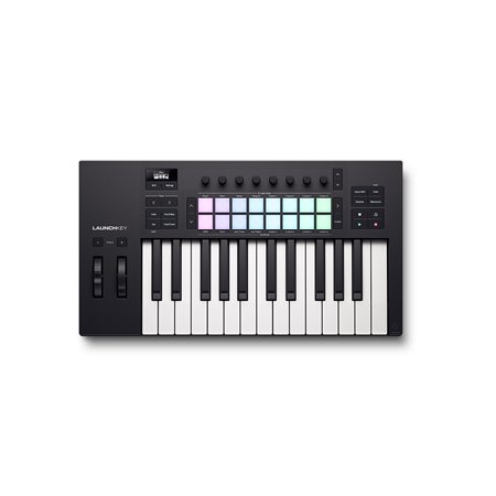 Novation Launchkey 25 MK4 – MIDI клавіатура, 25 синтезаторних клавіш, чутливих до сили натискання, 16 педів FSR з поліфонічним післядотиком, OLED-дисплей, 8 енкодерів, колеса зміни висоти тону та модуляції, вхід для педалі сустейна і вихід MIDI, живлення від USB, колір – чорний.